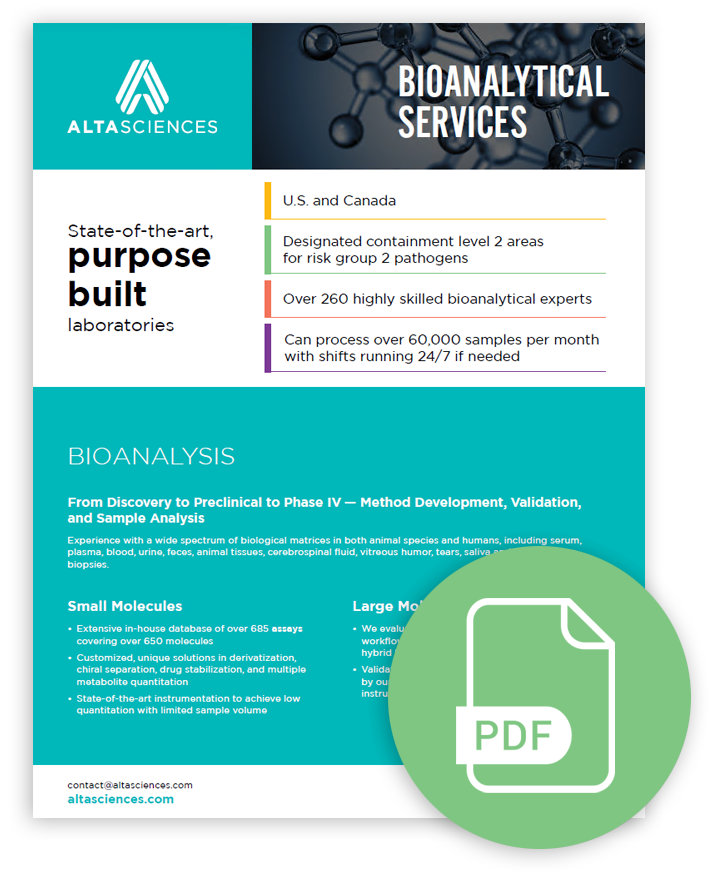 View this fact sheet that summarizes our bioanalysis services, which includes both small and large molecules, from the discovery stage, to preclinical, all the way to Phase IV.