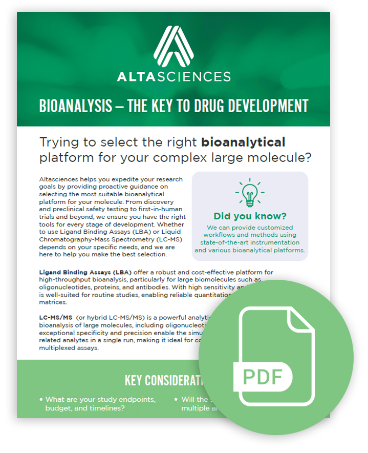 Explore Altasciences' comprehensive bioanalytical services, designed to deliver accurate and reliable data at every drug development stage. From method development to sample analysis to immunogenicity testing, gene therapy support, biomarker analysis, and more, our expertise facilitates seamless integration with your preclinical and clinical programs, supporting confident decision-making.
