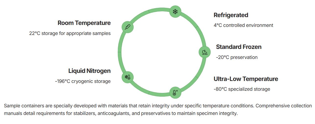 We maintain specimen integrity with advanced storage solutions designed for precise temperature control. Samples are stored under optimal conditions, from cryogenic preservation at -196°C in liquid nitrogen to 22°C for room-temperature storage. Our facilities support refrigerated (4°C), standard frozen (-20°C), and ultra-low frozen (-80°C) environments. Specialized containers and carefully selected materials protect each sample, ensuring the preservation of quality for accurate and reliable results.