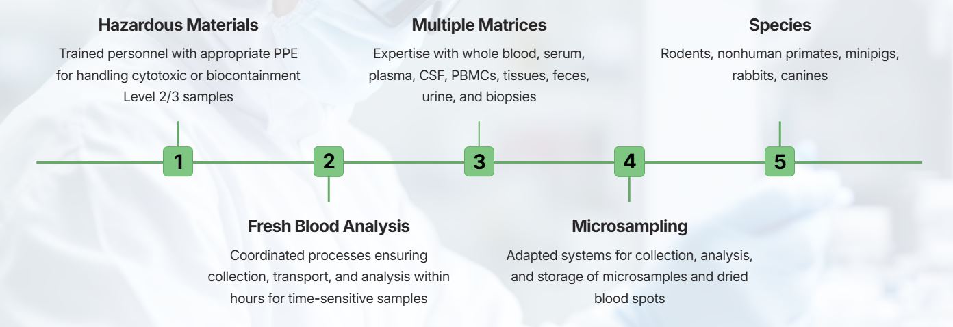 Our trained personnel handle hazardous materials in strict accordance with safety protocols. This includes cytotoxic substances and biocontainment level 2/3 samples. We have extensive experience working with biological matrices from both animal and human origin, such as whole blood, serum, plasma, CSF, PBMCs, tissues, feces, urine, and biopsies. Throughout the entire process, we maintain the full chain of custody and traceability to ensure sample integrity and regulatory compliance.